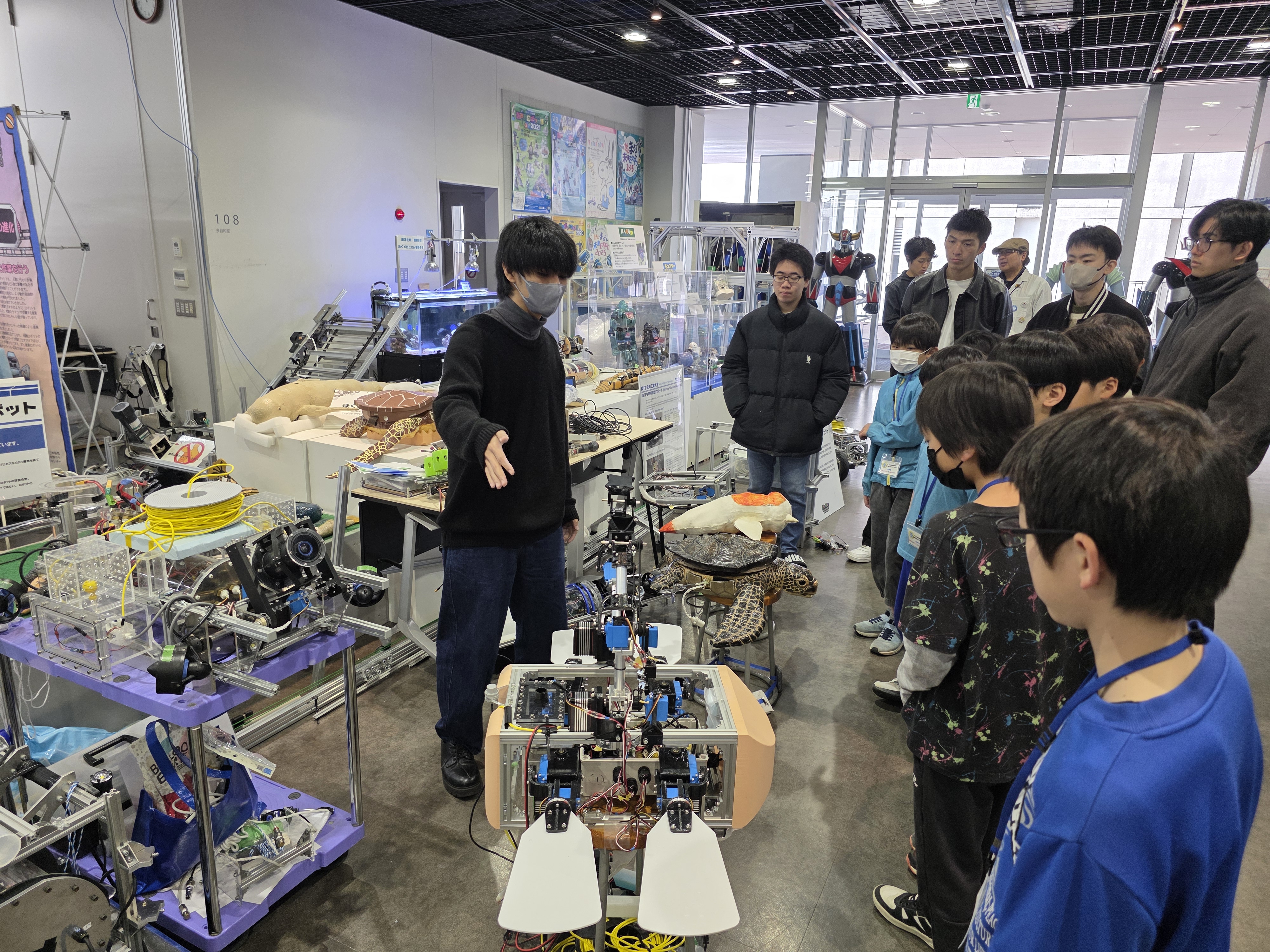 レスキューロボットや海洋生物ロボットなど、様々なロボットの様子やデモンストレーションを大学生の皆さんやロボ太郎先生の説明を聞きながら見学し、ロボットについて楽しく学びました。
