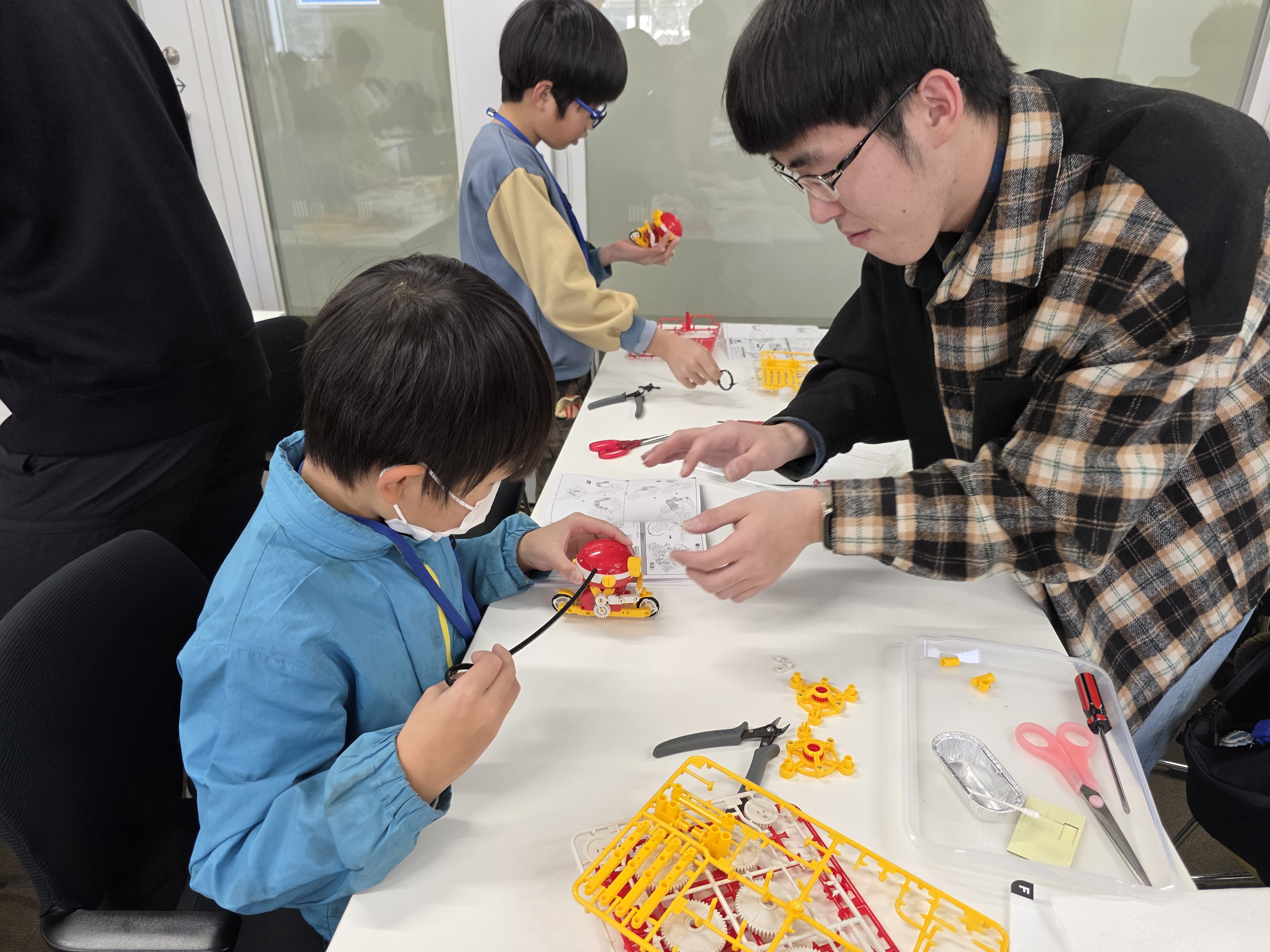 午後はジャイロ効果で倒れずに動くからくりロボット「マッシュ!」の組み立てに取り組みました。